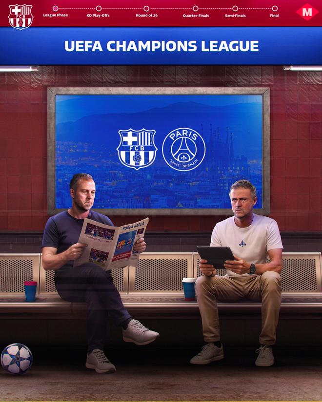 北京时间10月2日3:00,欧冠联赛再战一轮,巴萨将坐镇主场迎战卫冕冠军巴黎圣日耳曼。早些时候,巴萨俱乐部官方社交媒体发布了本场比赛的预热海报。海报中,两位主帅坐在长椅上,等待着列车的到来。恩里克手中拿着PAD,而弗里克则在一旁看着报纸,报纸上的新闻是2016/17赛季欧冠1/8决赛次回合,巴萨主场6-1逆转巴黎的诺坎普奇迹。有意思的是,当时的巴萨主帅恰恰是坐在弗里克旁边的巴黎现任主帅恩里克。
