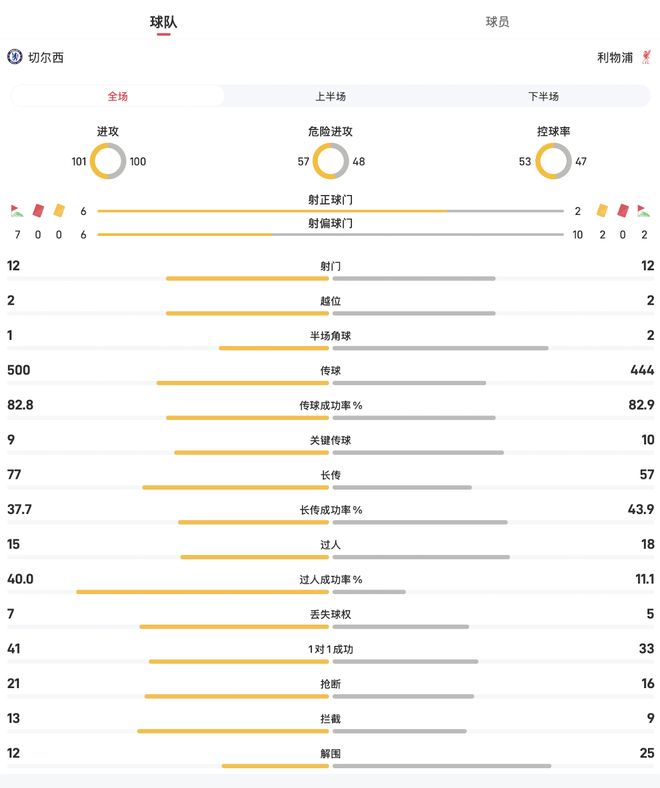 切尔西vs利物浦全场数据:射门1212,控球率53%47%
