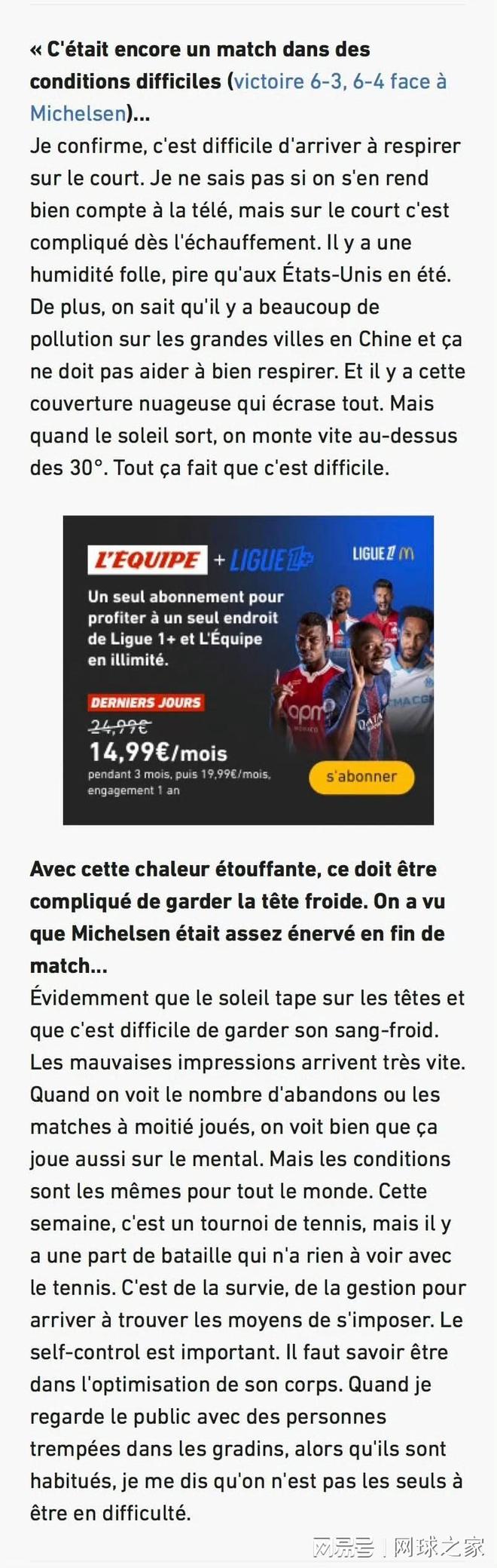 对此,法国人继续说道,“但比赛条件对每个人都一样。本周虽然是网球赛事,但存在与网球无关的较量。这是生存之战,是需要设法找到取胜之道的管理艺术。自控力至关重要,必须懂得如何让身体达到最佳状态。当我看到看台上汗流浃背的观众——就连本地观众都已浑身湿透,我就意识到,并非只有我们在承受这种考验。”
