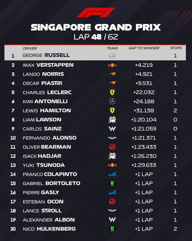 - 体育战报 | F1新加坡站正赛:拉塞尔杆位夺冠,维斯塔潘亚军,迈凯伦三四
