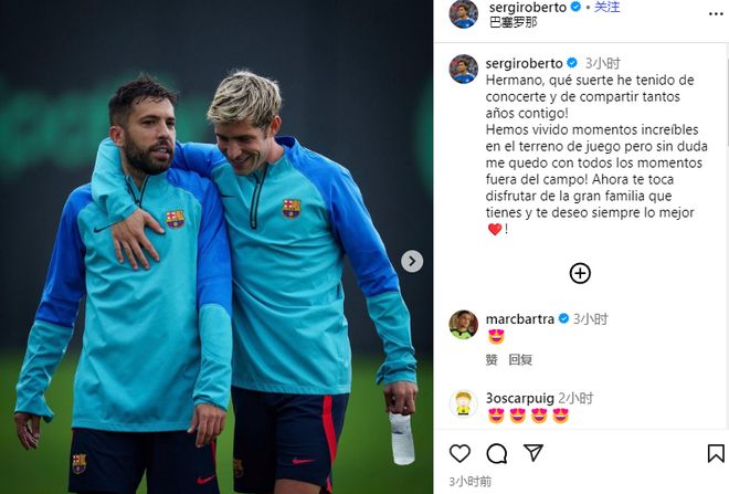 - 欧冠 | 罗伯托社媒告别阿尔巴:很幸运曾同你并肩作战,祝一切顺利