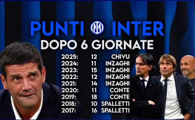 现年44岁的齐沃今年6月接手了国米,在世俱杯带队止步16强之后,新赛季他一度率队遭遇了联赛两连败,好在近期各项赛事的五连胜减轻了这位罗马尼亚教头肩上的压力,国米目前也以4胜2负的成绩位列意甲积分榜的第四位。根据Sportitalia的统计,齐沃执教国米意甲前6轮的成绩不及斯帕莱蒂、孔蒂以及西蒙尼-因扎吉执教蓝黑军团时的同期数据。在斯帕莱蒂接手国米的首个赛季,即2017-18赛季,意甲前6轮过后蓝黑军团的成绩为5胜1平。孔蒂执教国米的首个赛季(2019-20赛季)更是取得了前6轮全胜的完美开局。小因扎吉接手的2021-22赛季,国米意甲前6轮过后的成绩则为4胜2平。国米近9个赛季意甲前6轮成绩:2025-26赛季 4胜2负积12分 齐沃2024-25赛季 3胜2平1负积11分 西蒙尼-因扎吉2023-24赛季 5胜1负积15分 西蒙尼-因扎吉2022-23赛季 4胜2负积12分 西蒙尼-因扎吉2021-22赛季 4胜2平积14分 西蒙尼-因扎吉2020-21赛季 3胜2平1负积11分 孔蒂2019-20赛季 6战6胜积18分 孔蒂2018-19赛季 3胜1平2负积10分 斯帕莱蒂2017-18赛季 5胜1平积16分 斯帕莱蒂