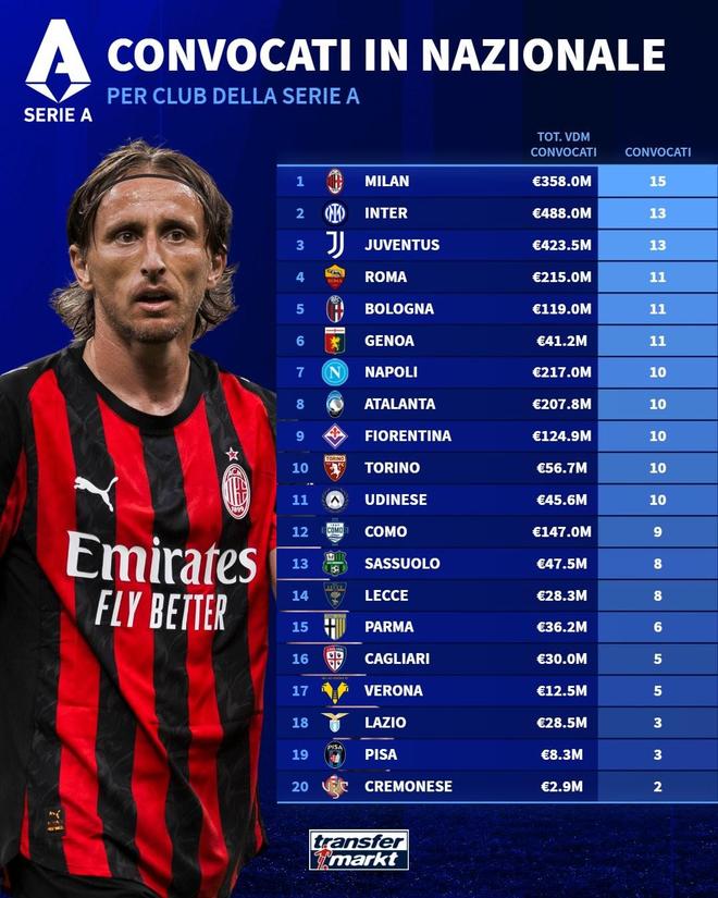 - 意甲 | 10月国际比赛日意甲球队被征召人数:米兰15人,国米尤文13人