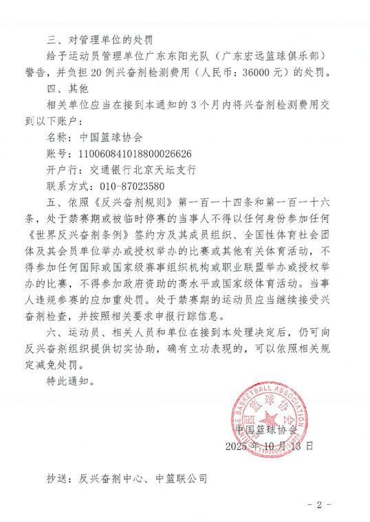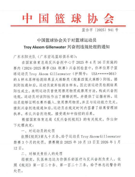 - CBA | 中国篮协:吉伦沃特兴奋剂违规禁赛3个月,广东队承担检测费
