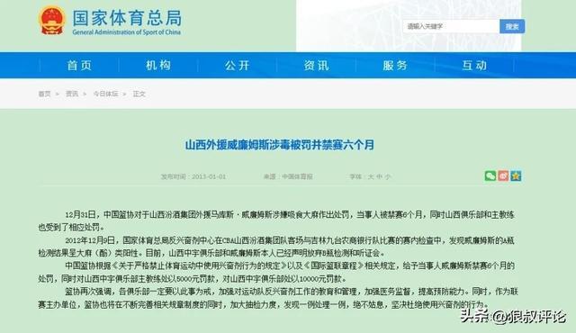 2012年12月9日,国家体育总局反兴奋剂中心在CBA山西汾酒集团队客场与吉林九台农商银行队比赛的赛内检查中,发现威廉姆斯的A瓶检测结果呈大麻(酚)类阳性。山西中宇俱乐部和威廉姆斯本人已经声明放弃B瓶检测和听证会。中国篮协根据《关于严格禁止体育运动中使用兴奋剂行为的规定》以及《国际篮联章程》相关规定,给予当事人威廉姆斯禁赛6个月的处罚,同时对山西中宇俱乐部主教练处以5000元罚款,对山西中宇俱乐部处以10000元罚款。