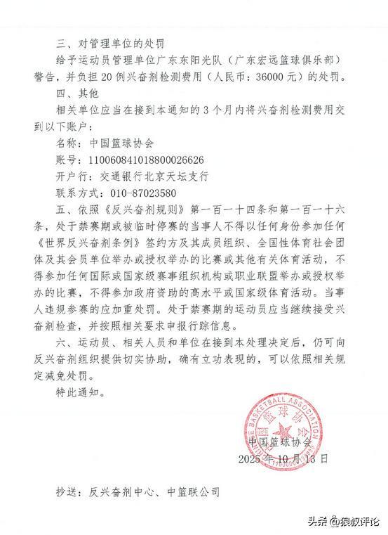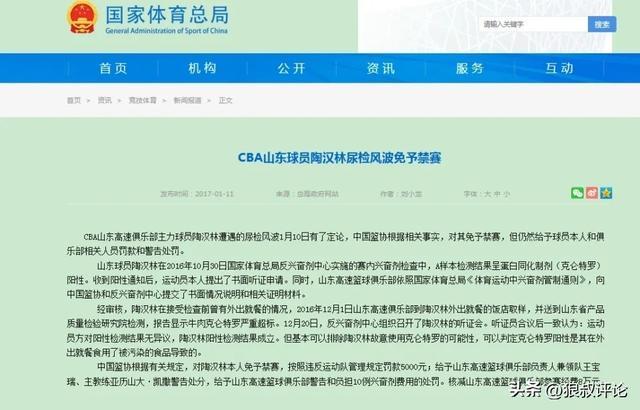 CBA山东高速俱乐部主力球员陶汉林遭遇的尿检风波1月10日有了定论,中国篮协根据相关事实,对其免予禁赛,但仍然给予球员本人和俱乐部相关人员罚款和警告处罚。山东球员陶汉林在2016年10月30日国家体育总局反兴奋剂中心实施的赛内兴奋剂检查中,A样本检测结果呈蛋白同化制剂(克仑特罗)阳性。收到阳性通知后,运动员本人提出了书面听证申请。同时,山东高速篮球俱乐部依照国家体育总局《体育运动中兴奋剂管制通则》,向中国篮协和反兴奋剂中心提交了书面情况说明和相关证明材料。中国篮协根据有关规定,对陶汉林本人免予禁赛,按照违反运动队管理规定罚款5000元;给予山东高速篮球俱乐部负责人兼领队王宝瑞、主教练亚历山大·凯撒警告处分,给予山东高速篮球俱乐部警告和负担10例兴奋剂费用的处罚。核减山东高速篮球俱乐部参赛经费8万元。