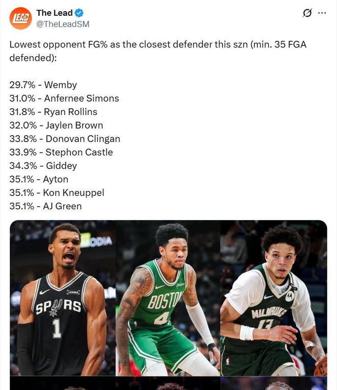 作为低位大杀器,文班亚马的远投效率还在提升,这让他更难以被防守。身高2米26的文班亚马,作为联盟现役最高的球员,不仅仅有着出色的内线终结技术,还精通后卫的外线持球单打技巧。文班亚马堪称是场上BUG,他在内、外线都能够完成得分。半场之内,都是文班亚马的得分区域。值得关注的是,文班亚马还有2项数据高居联盟第1。第1、文班亚马场均送出4.8次封盖,排名联盟第1。第2、美媒The Lead列出了一项防守数据统计,本赛季在防守对位时让对手投篮命中率最低的球员(至少防守35次出手)排行,其中文班亚马(29.7%)排在第一。文班亚马是NBA顶级防守者