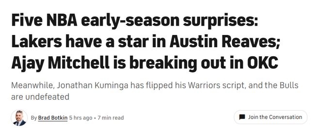 这样的防守效率或许难以长久维持,但公牛如今的表现确实亮眼:阵容深度雄厚,队中藏着不少实力派球员,其中6人(武切维奇、吉迪、多森姆、赫尔特、布泽利斯、特雷-琼斯)场均得分均达到至少13分。他们会全力干扰每一次投篮,篮板率也高居联盟前7,进一步巩固了防守成果。不过公牛接下来的赛程将变得艰难:未来10场比赛中,他们要两次对阵尼克斯,还要迎战76人、雄鹿、骑士、马刺、活塞和掘金。目前还无法确定他们的开局火热是真实实力的体现,还是又一次“伪强队”式的短暂爆发,但有一点可以肯定:这支公牛队本赛季大概率会给不少对手制造麻烦。4.阿贾伊-米切尔崭露头角雷霆本就拥有年轻的争冠阵容,未来7年还手握11个潜在首轮签,正当人们以为他们的天赋储备已达上限时,米切尔横空出世,成为赛季初期最亮眼的“黑马”球员之一。