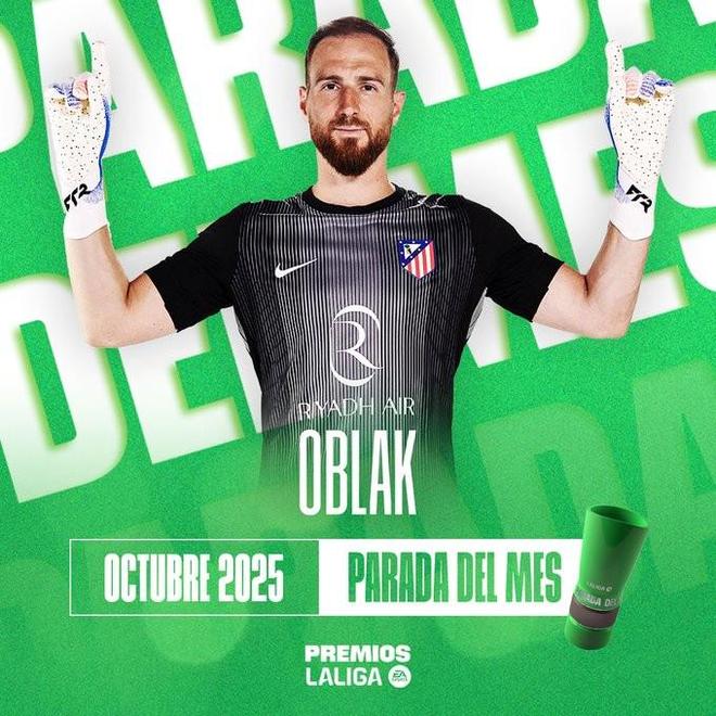 10月18日,西甲第9轮,马德里竞技主场对阵奥萨苏纳,奥布拉克在比赛第88分钟扑出了劳尔-加西亚的一次近距离射门,那是奥布拉克本场比赛做出的两次扑救之一,最终帮助马德里竞技1-0零封对手。最终经过评选,奥布拉克的这次关键扑救当选西甲官方10月份最佳扑救。