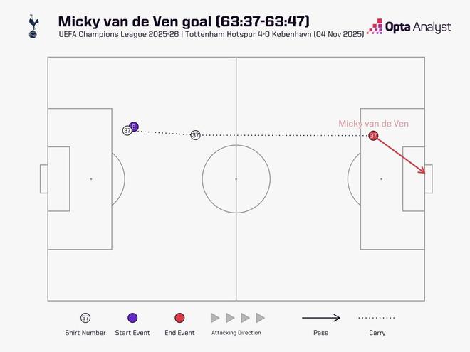 欧冠联赛阶段第四轮,热刺主场4-0大胜哥本哈根,热刺后卫范德芬在下半场长途奔袭打入一球,范德芬带球奔袭距离为67.7米,为有统计以来欧冠最长的奔袭破门距离。比赛第64分钟,热刺后卫范德芬从后场带球奔袭,10秒后在对方禁区内劲射破门。范德芬带球奔袭67.7米后破门得分,这是自2015-16赛季有统计以来欧冠联赛最长的奔袭破门距离。