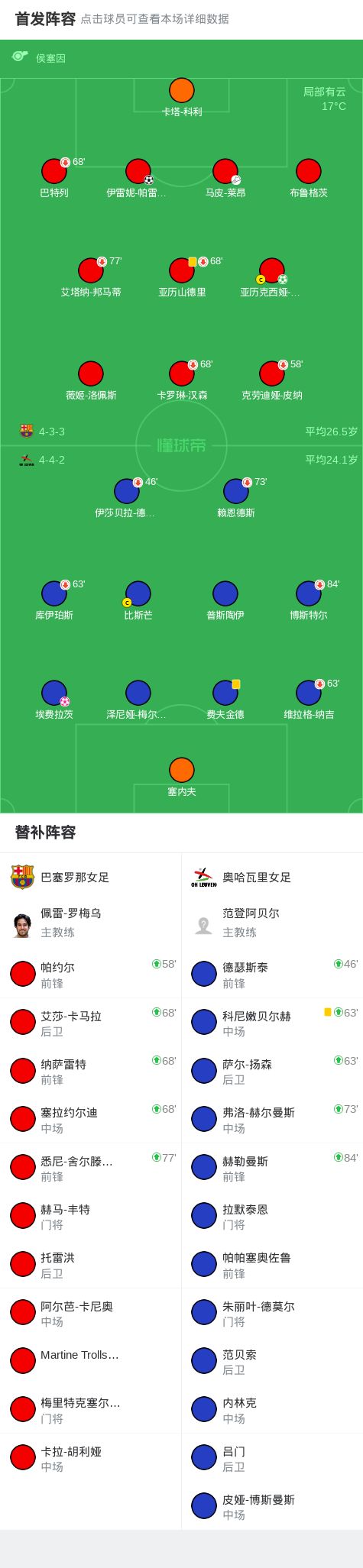 北京时间11月13日,女足欧冠联赛阶段第3轮展开较量,巴塞罗那女足以3:0战胜奥哈瓦里女足。比赛中,亚历克西娅-普特利亚斯主罚点球命中,为球队先拔头筹。随后,埃费拉茨不慎将球打入自家球门,扩大了对方领先优势。此后,伊雷妮-帕雷德斯接马皮-莱昂助攻再下一城,帮助球队锁定胜局。最终全场比赛结束,巴塞罗那女足以三球完胜对手,以3战全胜的战绩继续领跑欧冠联赛阶段积分榜。精彩瞬间上半场补时第1分钟,巴塞罗那女足球员亚历克西娅-普特利亚斯罚入点球。第56分钟,奥哈瓦里女足球员埃费拉茨自摆乌龙。第67分钟,巴塞罗那女足球员马皮-莱昂助攻伊雷妮-帕雷德斯打入一球。球队阵容