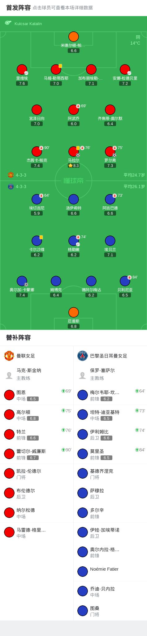 北京时间11月13日女足欧冠 联赛阶段 第3轮,曼联女足对阵巴黎圣日耳曼女足。曼联女足马拉尔破门,罗尔弗破门。巴黎圣日耳曼女足奥尔加-卡蒙娜破门。最终比分曼联女足 2-1 巴黎圣日耳曼女足。曼联女足取得女足欧冠的三连胜,同时送给巴黎女足3连败。精彩瞬间第31分钟,曼联女足球员里维埃助攻马拉尔打入一球。上半场补时第3分钟,巴黎圣日耳曼女足球员格勒嫩助攻奥尔加-卡蒙娜打入一球。第58分钟,曼联女足球员安娜-松德贝里助攻罗尔弗打入一球。球队阵容