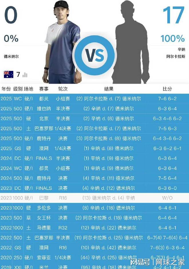到了2023年澳网,德米纳尔的世界排名不升反降来到第44位,而辛纳的排名已经飞速上升跻身世界前十。双方在八分之一决赛展开火拼,最终辛纳直落三盘过关;该年的马德里大师赛,双方在较浅轮次又有过一次交手,这次辛纳大比分完胜。