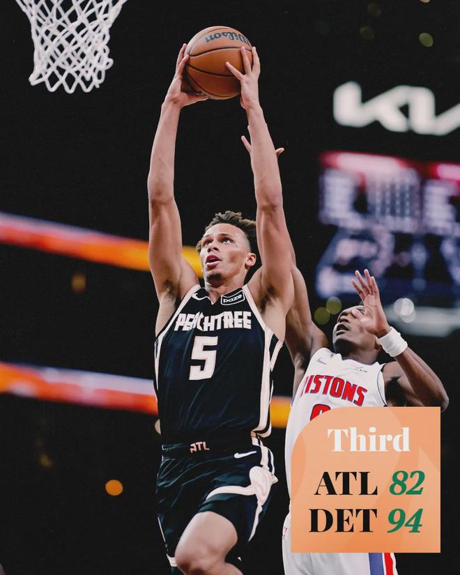 第二节初段,活塞针对肯纳德这个防守短板,打出一波12比3。活塞最多领先到19分,老鹰在杰伦-约翰逊的率领下苦苦追分,上半场约翰逊8投5中砍下14分4板5助。值得一提的是,过去两周东部周最佳,分别是坎宁安和杰伦-约翰逊。半场战罢,活塞67-54依然领先13分。坎宁安外线手感不佳,上半场三分球3中0,但两分球3中3,半场砍下10分6篮板8助攻。活塞是背靠背作战,下半场老鹰开始提速,对活塞体力是个考验。老鹰第三节28-27,单节追回1分。