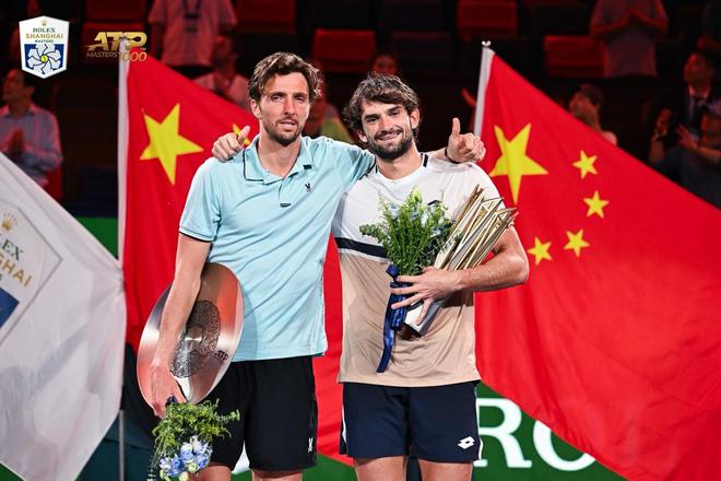 2025年上海劳力士大师赛单打冠军瓦朗坦·瓦舍罗(右)及亚军阿蒂尔·林德克内希