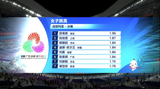十五运会田径女子跳高比赛中,上海运动员陆佳雯成功越过1米87的高度,获得银牌,湖北队邵雨琪获得金牌,河北队胡麟鹏获得铜牌。