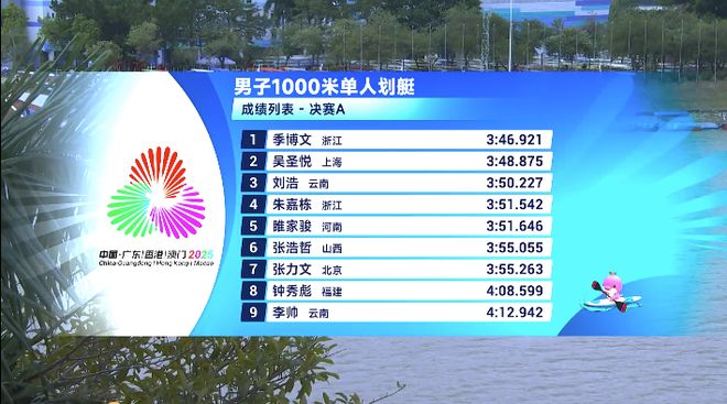 十五运会皮划艇静水男子1000米单人划艇比赛中,上海运动员吴圣悦以3分48秒875的成绩完赛,夺得银牌。浙江选手季博文收获冠军,云南选手刘浩位列第三。