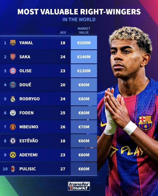 奥利塞(Michael Olise)国籍:法国俱乐部:拜仁慕尼黑年龄:23身价:1.3亿欧元多埃(Désiré Doué)国籍:法国俱乐部:巴黎圣日耳曼年龄:20身价:9000万欧元罗德里戈(Rodrygo)国籍:巴西俱乐部:皇家马德里年龄:24身价:8000万欧元福登(Phil Foden)国籍:英格兰俱乐部:曼城年龄:25身价:8000万欧元