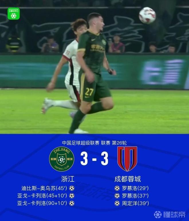 第二十六轮 浙江3-3成都蓉城联赛争冠已经进入白热化,成都蓉城在本轮客战浙江上半场就取得了3-0领先,然而在随后的比赛中防守出现了问题,浙江外援卡列洛在伤停补时阶段完成绝平,成都蓉城就此让出了榜首的位置。