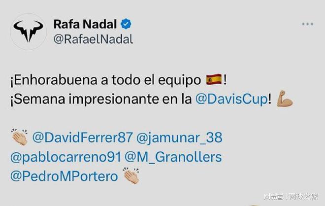 虽然西班牙队未能如愿夺冠,但是红土之王纳达尔还是在赛后发文,祝贺西班牙队在本届戴维斯杯团体赛上取得亚军的佳绩。 西班牙队上一次夺得戴杯冠军是在2019年,当时的纳达尔五场单打全胜,且两次赢下双打决战的胜利,帮助球队第六次捧起戴维斯杯冠军奖杯。