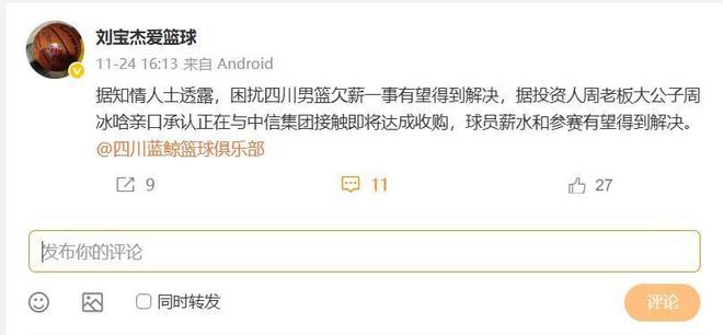 今年夏天四川队被曝出球员和教练组、管理层被欠薪3-9个月不等,社保更是有28个月未缴纳,球队面临被强制退出CBA的窘境。四川队老板一直在寻求外部投资,或者是变卖球队股份进行自救,根据消息称近期四川队球员前往青岛进行体测球队仅负责机票钱,其余的差旅费需要自理,现在四川队找到了投资人不仅可以解决球员的欠薪和社保问题,这次球员去体测的食宿费用应该也可以报销了吧。