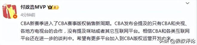 媒体人付政浩发文点评:“CBA新赛季进入了CBA赛事版权销售新周期。CBA发布会提及的只有CBA和央视、各地方电视台的合作,没有提及咪咕或者其它互联网平台。相信CBA和各类互联网平台还在进一步的谈判中。希望有更多平台加入到CBA版权运营开发中来。在去年年底的咪咕合作伙伴大会上,咪咕曾宣布与CBA达成战略合作,宣布双方续约至2029-2030赛季,如今来看,那次更像是合作意向框架。”