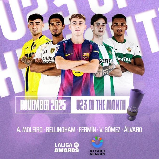 北京时间11月27日,西甲官方公布了联赛11月最佳U23球员的5位候选者,费尔明-洛佩斯和贝林厄姆在列。
