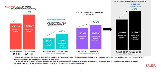 日前, 西甲联盟完成了2027/28-2031/32赛季西甲联赛(LALIGA EA SPORTS)西班牙国内付费电视版权的招标工作,该板块版权总价值突破52.5亿欧元,较上一周期(2022-2027赛季)49.5亿欧元的付费电视版权收入增幅达 6%。西班牙电信(Telefónica)与DAZN两家平台成功中标,未来五个赛季,每家平台每个比赛日将直播5场西甲赛事。根据新合同,西甲联盟国内视听版权总收入包括:西甲联赛(LALIGA EA SPORTS)付费电视板块收入52.5亿欧元、商业场所(HORECA)板块收入6.5亿欧元、西乙联赛(LALIGA HYPERMOTION)板块收入1.75亿欧元、免费电视及赛事集锦版权收入 6000万欧元。各项收入总计达到61.35亿欧元,这较上一周期增长 9%。