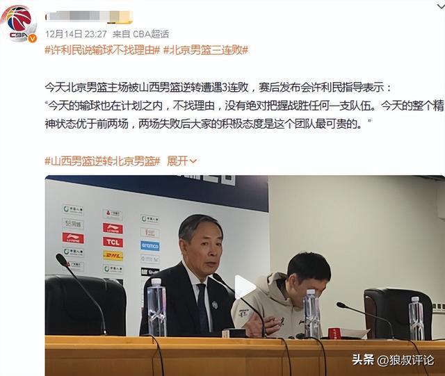 上赛季,北京男篮短时间内遭到山西双杀,以及不敌广东的新闻发布会,许利民的采访提到三连败仍在计划内。不找理由,没有绝对把握战胜任何一支队伍。整个精神状态优于前两场,两场失败后大家的积极态度是这个团队最可贵的。