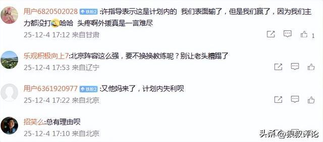 也有球迷调侃,输球的计划内又来了,我们表面输了,但是我们赢了,因为我们主力都没打,外援真是一言难尽。为什么球迷这么多吐槽?实际与上个赛季许利民赛后各种“逆天言论”存在直接的关系。24-25赛季,北京107-113不敌山东。赛后,北京主帅许利民出席了新闻发布会。提到北京男篮输球仍是胜利者引发球迷和媒体的热议。