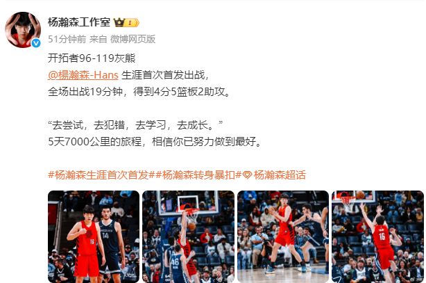 赛后,杨瀚森工作室发表微博:“去尝试,去犯错,去学习,去成长。”5天7000公里的旅程,相信你已努力做到最好。