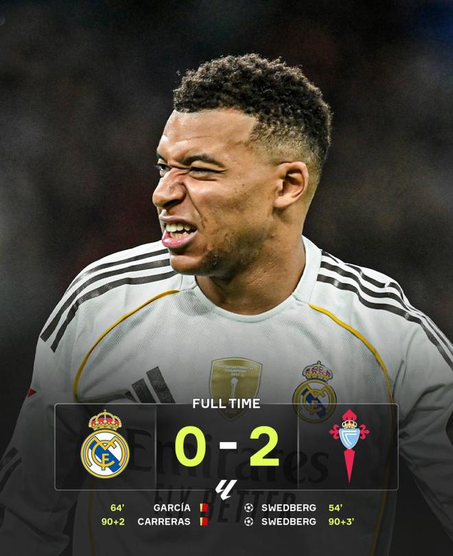 北京时间12月8日凌晨,西甲第15轮继续开打,伯纳乌上演超级冷门,总身价高达14亿欧元的皇马在主场惨遭塞尔塔2-0击败,赛季主场全胜金身破裂,更诡异的是,两名边后卫同时染红、中卫米利唐再次重伤离场,银河战舰进入伤病与红牌双危机;与此同时,同轮另一场比赛中,西班牙人凭借23岁悍将罗伯托的一剑封喉,1-0险胜巴列卡诺,豪取三连胜,一跃升至积分榜第5,并且还少赛一场;西甲争冠与争四越来越乱啦。皇马0-2塞尔塔,5轮仅1胜全面告急本轮之前,皇马刚刚终结三连平,客场3-0击败毕尔巴鄂,让人以为状态有所回升。然而与塞尔塔的比赛,再次暴露出阿隆索执教下皇马的诸多隐患:后卫伤兵满营、攻坚能力不足、心态波动明显。比赛开打至第9分钟,塞尔塔前锋萨拉格萨反越位成功,突破时被库尔图瓦放倒,现场一度以为是点球+红牌的大麻烦,好在边裁举旗示意越位,皇马逃过一劫。第23分钟,皇马后防遭遇重大打击。米利唐在一次高速回追中强行解围后突然倒地,捂着大腿痛苦不已,被搀扶下场。这是他本赛季第三次受伤,更糟糕的是,皇马原本就有多达5名后卫在伤停名单里。随着米利唐倒下,球队健康可用的后卫只剩:吕迪格、劳尔·阿森西奥、卡雷拉斯和弗兰·加西亚。阿隆索现如今已经是巧妇无米之炊了。随后皇马疯狂冲击客队后防,贝林厄姆混战中抽射,维尼修斯补时阶段劲射,但塞尔塔门将拉杜犹如神助,完成多次关键扑救,将上半场比分保持在0-0。易边再战,塞尔塔替补奇兵斯维德贝里第54分钟破门,皇马0-1落后;紧接着皇马再遭暴击,第63分钟、第64分钟:弗兰·加西亚两分钟内连吃两张黄牌,被罚下!这是他职业生涯第一次染红,阿隆索在场边直接愣住,皇马只能10人应战。伤停补时阶段:卡雷拉斯因抱怨定位球位置,先被出示黄牌,随后继续喋喋不休,被直接红牌罚下,皇马变成9人,短短一个半场,皇马两名边后卫先后被红牌罚下,主场不败才怪。更离谱的是,替补席上的恩德里克因不满判罚居然也吃到红牌,皇马一场3红牌,这也是无语啦。补时阶段,阿斯帕斯送出精准直传,斯维德贝里将球趟过库尔图瓦推射破门,梅开二度,最终塞尔塔2-0爆冷皇马,是这双方近23次锋中,皇马首次败北,同时本赛季主场全胜纪录终结。最近5轮联赛,皇马只赢了一场,阿隆索的压力达到执教巅峰级别。西班牙人1-0巴列卡诺相较于皇马的惨状,西班牙人本轮表现堪称稳健又高效。西班牙人最近5场比赛赢了3场,而巴列卡诺仅取得1胜。更关键的是,两队最近3次交手,西班牙人全部获胜,心理优势明显。比赛第39分钟,西班牙人制造点球机会,23岁的西班牙前锋罗伯托操刀主罚,一蹴而就,1-0领先!易边再战,下半场第64分钟,巴列卡诺球员洛佩斯两黄变一红被罚下,客队被迫十人应战。但西班牙人也在第87分钟遭遇打击,多兰同样两黄变一红,双方人数回到10打10,剩余时间里,西班牙人顺利顶住压力,最终比分定格在1-0,豪取3连胜,积分来到 27分,直接升到西甲第5,距离前四的马竞只差4分,并且少赛一场。