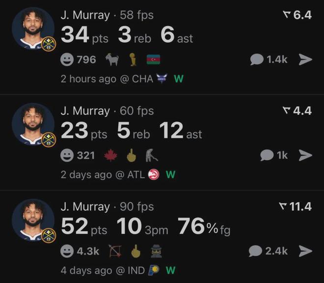 12月4日掘金135-120大胜步行者,穆雷25投19中,三分11中10,罚球5投4中,狂轰52分6篮板4助攻。掘金本赛季已有三人砍下50+(约基奇、戈登和穆雷),NBA史上第三次出现,此前两队是1961-62赛季的湖人和2018-19赛季的勇士。
