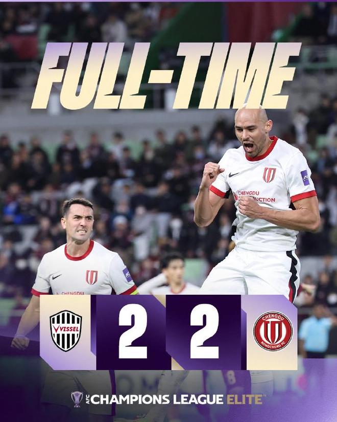 在先丢1球的情况下,成都蓉城由费利佩连入2球,一度逆转了比分。遗憾的是,李扬最后时刻送出点球,让对手最终扳平了比分。面对目前排名东亚区榜首的神户胜利船,成都蓉城表现出色,全场有11次射门、3次射正,对手只有10次射门2次射正。