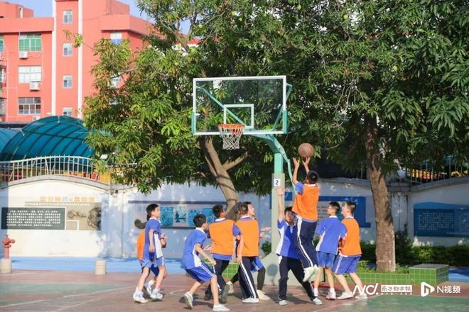 蔡梓嘉在篮球场练球。谈及篮球带来的改变,蔡梓嘉坦言,自己的身体协调性更好了,每次投篮成功时,还会感到很自信。采访时,他还向记者秀出了自己的独门绝技“蝴蝶穿花”——运球时走出灵动的蝴蝶走势,引得一旁同学称赞不已。平日里,蔡梓嘉在周末或是完成作业后,常约上朋友组队打球。他的个人视频号里,也记录下了许多投篮的瞬间。曾与他同场过招的同学都表示,蔡梓嘉打球极具个性,“快、准、狠”是他鲜明的风格。03师徒PK、单挑学长日常打磨撑起篮球自信作为指导者,周飞也常会给蔡梓嘉传授实用技巧,现在蔡梓嘉已经能出色掌握胯下运球、背后运球、体前运球,还有各种节奏变化加速等动作。这次单挑威姆斯时,他用到的胯下、背后运球、体前假动作、拜佛等招式,其实都来自平时训练的功底。篮球校队平时会按常规计划训练,但周飞偶尔也会给这位“尖子生”增加训练量。比如让他多和初三的学长单挑,逼着他运用所学技术去适应更高强度的对抗。周飞有时也会亲自下场和蔡梓嘉单挑,师徒俩私下PK时,蔡梓嘉也时常能突破他的防守。04从校园体育大课到全民健身描绘深圳人的运动图景采访当天,正赶上海滨中学每周的“年级体育大课”。校园里处处洋溢着运动的热潮,但凡校园内能运动的空间,都站满了学生,排球、篮球、跳绳、跑步……初三的学生们沉浸在不同项目中不亦乐乎。令人眼前一亮的是,AI打卡的融入,让这场体育大课更具科技感与趣味性。“体育不仅能够强身健体,更能够锤炼意志,培养孩子们的团队精神,为学生的未来发展注入持久的能量。”海滨中学党总支书记陈恒周向记者表示,学校致力于让锻炼成为孩子们的日常习惯,通过落实每天一节体育课、丰富大课间活动、推广课间微运动等举措,保障孩子们充足的运动时间,让运动成为生活的一部分。
