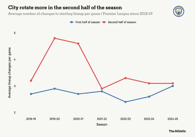 这已不是2023年残酷追赶阿森纳的那支曼城队。那支球队的三分之二球员已被出售。这台机器有了许多新部件,运作方式也已不同,但它仍然拥有大量经验丰富的赢家。鲁本-迪亚斯、伯纳多-席尔瓦、福登和哈兰德都曾不止一次随曼城赢得英超冠军——有些甚至多达五次。这支曼城是否拥有同样的能力,同样的韧性,能够连续数月保持专注?这将决定阿森纳(目前仍是最大热门)在寻求结束长达21年的国内顶级联赛冠军等待时,是否会被迫汗流浃背直到最后一刻。这很可能始终是一个曼城需要后来居上的赛季。他们本赛季的准备工作因参加六月和七月的世俱杯而缩短(夏训仅19天,而前一年夏天是34天),并且自一月份以来需要整合10名新援。他们的季前准备基于与以往相同的动机,即让球员在赛季最后几个月达到巅峰。熟悉曼城规划和方法的消息人士(他们要求匿名以保护关系)告诉The Athletic,他们的工作安排和节奏背后有科学依据,以避免倦怠并确保状态的持久性。在周三于伯纳乌2-1战胜皇家马德里的欧冠比赛前,瓜迪奥拉再次强调,目前这个阶段的目标仅仅是保持与榜首的接触。他说,发力的时候会到来,但赛季是“过山车”,在这些冬季月份里,他寻找的只是球队每月整体上有所改善的迹象。他从目前的团队中看到了足够的东西,相信“我们会达到那个高度”。他的队长伯纳多强调,关于赢得冠军所需的积分,心态可能已经发生了变化。在与克洛普的利物浦竞争的那些赛季,标准被提高到了至少38场90分。这位葡萄牙中场暗示这次情况将不同,他预测从现在到五月,曼城和阿森纳都会丢掉"很多分数"。“这不会让人感到意外,”他在周一赛前新闻发布会上说。“我们的主要目标是做好自己。如果我们做到这一点,我们知道我们有很大的机会去争夺冠军。确实,我们(在曼城)的球队总是在赛季后半段表现好得多。希望这次再次发生,因为我不认为我们这个赛季表现糟糕,但在一些比赛中,我们的表现没有达到应有的水平。”“我们期待着到达那些阶段,那时(我们的状态)会比八月或现在好得多。我们已经看到了进步;我们踢得、表现得比第一个国际比赛日(九月)前好多了。我们输给了布莱顿和托特纳姆热刺(在八月),以我们水平而言不可接受的表现输掉的,所以我们正在一天天进步。”我们尚未看到他们达到全速,但瓜迪奥拉现在已经在大多数位置上确定了他的首选阵容。福登、谢尔基、杰里米-多库和哈兰德组成的进攻四人组之间正在形成一种令人生畏的协同效应。过去三场英超比赛打入11球,使得他们本赛季至今15场比赛总进球数达到35个,比联赛进球第二多的阿森纳多7个。联赛积分榜的“进球数”栏目是预测球队整个赛季能获得多少积分的最准确指标,很难想象曼城不会在这个榜单上名列前茅。瓜迪奥拉比往常更多地坚持使用这套首选阵容,也许只是为了现阶段能跟上节奏,但在下半赛季,他肯定需要信任他更广泛的阵容。球员轮换及其带来的休息,一直是曼城在赛季后半段表现出色的关键支柱。