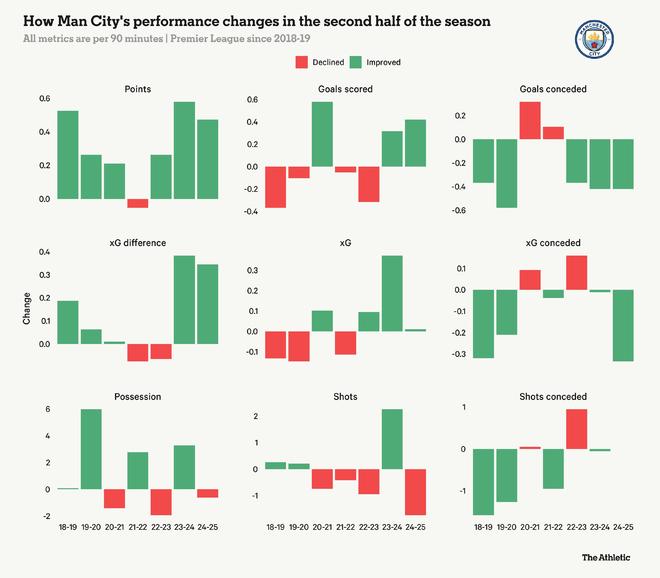 在上周六阿斯顿维拉最后时刻绝杀阿森纳之后,亨利对许多枪手球员失望地瘫倒在草坪上的情景感到担忧。他在CBS体育节目中说:“当他们在最后时刻丢球时,每个人都倒在地上,好像失去了什么似的。你们只是输掉了一场比赛。就像赢球并不意味着你们就能赢得一切一样。但是(阿森纳)客场输给了维拉,每个人都倒下了,好像我们失去的东西比实际失去的更重要。”在亨利看来,阿森纳必须意识到,这只是由38场比赛组成的漫长英超赛季中的一场比赛,仅占总赛程的2.63%。尽管他的老东家在过去三个赛季都未能最终夺冠,每次都屈居亚军,但维拉公园球场发生的事件可能表明他们需要找到一些正确的视角。但是,如果正是这种“视角”让所有这些阿森纳球员跪倒在地呢?他们知道自己失去的不仅仅是一场比赛。曾有机会在英超积分榜上将领跑优势扩大到接近追赶集团的两倍,但过去五场联赛仅赢两场的战绩,突然给了曼城将分差缩小到两分的机会。曼城抓住了机会,几小时后以3-0轻取桑德兰。他们当然做到了。如果说有什么触发了阿森纳的焦虑,那将是排名第二球队的身份。他们再清楚不过,在冠军争夺战中,曼城是令人生畏的追赶者。在瓜迪奥拉在曼城完成的九个赛季中,只有三个赛季他们没有参与冠军争夺——他的处子赛季2016-17年(他们获得第三名,落后冠军切尔西15分),利物浦在2019-20年轻松夺冠(曼城获得亚军,但落后18分),以及斯洛特去年在安菲尔德俱乐部上任首年便夺冠(曼城再次排名第三,落后13分)。其他六个赛季呢?他们每次都能最终胜出。其中两次,他们早早便遥遥领先。然而历史表明,他们习惯于让其他人领跑,然后在最后直道上无情地完成超越。“我们赢得了六次英超冠军——其中四次是在一月或二月时我们还落后的情况下,”瓜迪奥拉在回应关于他们最近对阵富勒姆时(比赛第60分钟前曾四球领先)那场5-4的混乱胜利并非冠军之师表现的言论时告诉记者。“赢得英超冠军的球队是那个(在整个赛季中)不断成长的球队。”2018-19赛季便是如此,当时曼城在最后14场联赛中全胜,以1分优势力压利物浦夺冠。2022-23赛季,他们从二月到五月保持了16场不败(包括15场胜利),扭转了一月份时落后领头羊阿森纳8分的局面(阿森纳那个赛季共领跑248天)。次年,他们在进入四月时还落后于阿森纳和利物浦,但随后取得九连胜,率先冲线。唯一一次在后19场比赛比前19场比赛失分更多但仍夺冠的是2021-22赛季,他们也在最后一天顶住了利物浦的挑战。尽管如此,从新年开始到赛季结束的18场联赛中,他们总共也只丢掉了11分,仅输一场。这些都是曼城势不可挡的赛季,一旦他们挂上五档,便似乎无人能及。下图中的数字显示,他们的积分往往在赛季中期后飙升,并且其基础是防守端逐渐稳固。瓜迪奥拉会利用上半赛季的经验教训来填补漏洞,为另一座冠军铺平道路。