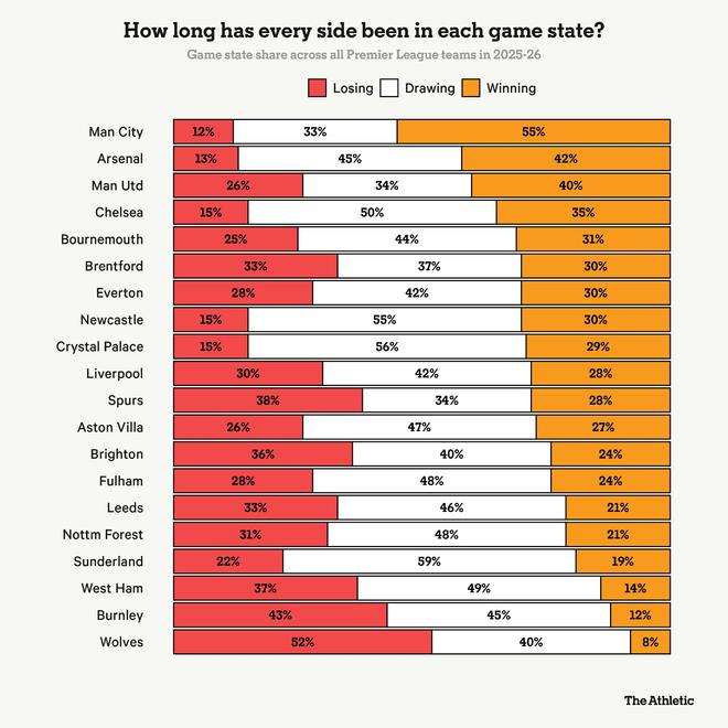 在上个月曼联2-1战胜水晶宫之后,鲁本-阿莫林指出了比赛中一个让他满意但仍需改进的方面。在领先后控制比赛,是曼联本赛季的短板之一。自2025-26赛季开始以来,曼联多次在比赛中取得领先,却随后失去控制并丢球。“当我们进球后,我们就忘记了应该保持的比赛方式,”阿莫林在八月份1-1战平富勒姆后说道。“我们只想着保住比分。我们求胜心切,以至于忘记了保持控球、尝试压迫对手(使其退防)。我们多少是把比赛(主动权)让给了富勒姆。”这种领先优势的丧失在十一月份对阵诺丁汉森林和托特纳姆热刺的2-2平局中再次打击了球队。“我们失去了五分钟对比赛的控制,并为此付出了代价,”曼联主教练在城市球场的赛后新闻发布会上说。这一趋势在对阵西汉姆联的1-1平局中得以延续,当时松古图-马加萨在第83分钟扳平比分,抵消了迪奥戈-达洛特的制胜球。即使曼联在对阵西汉姆联时没有完全失去控制,他们也没能创造出足够的机会打入第二球以终结比赛。时间快进到周一晚上4-4战平伯恩茅斯的比赛,曼联在领先局面下掌控比赛的问题暴露无遗——上半场错失扩大比分的机会,下半场伊始失去控制,并在比赛尾声阶段未能守住4-3的胜局。“如果你看这场比赛,你可能会认为我们是在下半场丢掉了这两分,”阿莫林赛后告诉记者。“但我认为我们是在上半场丢掉了这两分。我们应该有更多进球——半场时的比分本应不同。”曼联在领先局面下无法扩大比分的能力反映在他们的预期进球数据上。本赛季,阿莫林的球队在领先时的非点球预期进球比实际进球少了3.2个——这是英超联赛在领先局面下最大的差值。由于未能扩大领先优势,曼联让对手始终保持在比赛悬念中,从而威胁到球队为取得领先所付出的努力。本赛季,曼联在16场英超比赛中有11场能够率先破门,他们在领先局面下度过了40%的比赛时间——这一比例在联赛中仅次于阿森纳(42%)和曼城(55%),位列第三。