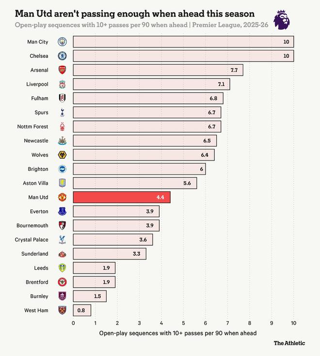 然而,曼联在领先局面下的表现常常缺乏维持比分所需的控制力。阿莫林的球队在应该放慢节奏、控制球权并等待正确时机进攻时,却总是以同样的节奏进行比赛。“我们开局真的很好,上半场表现非常出色——比分本应完全不同,”阿莫林在战平伯恩茅斯后告诉天空体育。“再一次,我认为下半场有六分钟的情况与对阵诺丁汉(森林)时相似。我们失去了专注力。”“我们设法重新回到比赛,然后我们必须终结比赛。仅仅是一次我们拥有球权的界外球,我们需要考虑的不是再次进攻,而是保持冷静并终结比赛。”简而言之,曼联在领先时传球不够多。从拥有10次或以上传球的开放进攻序列次数来看,曼联本赛季在领先时每90分钟仅有4.4次,这是英超联赛中第九低的比率。