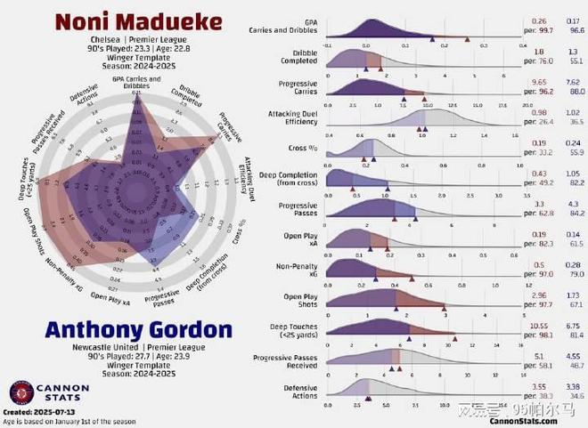 切尔西时代的马杜埃凯虽入选过三狮军团,但92场比赛20粒进球和9次助攻的成绩单显然支撑不了天之骄子的光环,更像是一块豪门边角料,然而他有拿得出手的成绩单,或者说让阿尔特塔心动的筹码。比如算上埃因霍温时期,马杜埃凯累计对阿森纳打进了6球,上赛季更是充分展示了左右脚均衡的射门能力(65.8%左脚,34.2%右脚),稍微意外的是,作为推进类型的边锋,马杜埃凯每90分钟内尝试射门高达3.5次,并且集中在禁区内。速度快和爆发强,这是有尼日利亚血统的马杜埃凯的显著标签,这不是秘密,只是当外界逐步认为他会成为萨卡的优质替身时,忽视了他曾在切尔西和英格兰国家队客串左边锋的能力,难怪阿尔特塔用“创造型球员”形容新人。