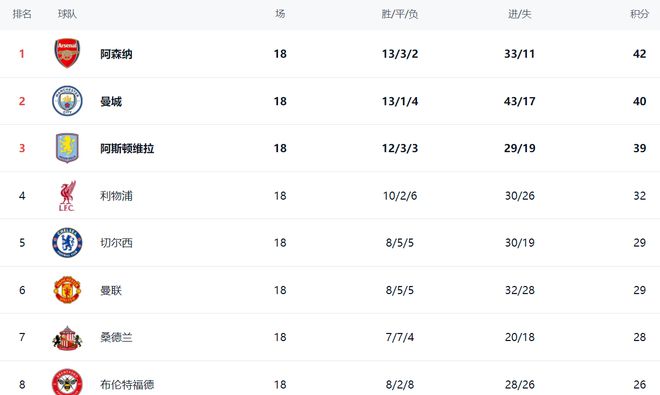 在积分榜上,阿森纳的战绩是13胜3平2负,以42分高居榜首。不过,阿森纳的领先优势很少,身后的曼城追得很紧。曼城总积分是40分,排名第2,只落后阿森纳2分。第3名的阿斯顿维拉的战绩也是极其出色,拿到39分,比阿森纳只少3分。现在的争冠格局就是三国鼎立,每一轮比赛的结果都有可能导致榜首的易主。