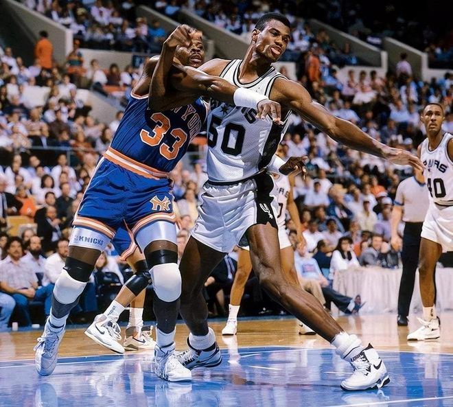 时隔5年重回总决赛,却被马刺双塔压制。伴随着乔丹在1995年宣布复出,NBA再度被公牛队所统治,一直到乔丹在1998年第二次离开,尼克斯队才得到了机会。98-99赛季恰逢NBA的缩水赛季,由于常规赛只打了50场比赛,所以虽然尼克斯队的战绩仅仅排名东部第八,但他们的实力还是被低估了。36岁的尤因在这一年,仍旧可以贡献17.3分、9.9个篮板和2.6次盖帽,是球队的内线支柱。而且更令人动容的是,在季后赛中,他一直都带伤出场,虽然能力有所下滑,但却甘愿化身蓝领,辅佐阿兰·休斯顿、拉特里尔·斯普雷维尔的双枪组合,场均仍有13.1分、8.7个篮板的贡献。而尼克斯队也是上演了惊人的黑八奇迹,一路打进了总决赛。但这一次,尤因的对手是更为年轻的蒂姆·邓肯,和同为四大中锋的大卫·罗宾逊。不得不说,尤因为了能够拿到冠军,拼尽了老命,场均可以得到13.5分、6.5个篮板,但无奈伤势过重,他只打了2场比赛,就不得不告别了赛场。尼克斯内线的空虚,让马刺队占尽优势,最终马刺队只用了5场比赛,便解决了战斗,而尤因也是就此失去了争夺总冠军的最后机会。