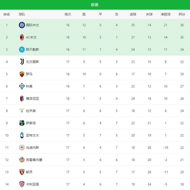 意甲战火持续升温,第17轮联赛迎来多场焦点战。AC米兰3-0完胜维罗纳、那不勒斯客场2-0击败克雷莫内塞、国际米兰1-0力克亚特兰大,多场焦点战同时落幕,意甲最新积分榜也随之出炉。争冠集团与欧战区的竞争,在这一夜再度被拉开层次。亚特兰大vs国际米兰先看亚特兰大与国际米兰的直接对话,是一场榜首与状态最火热球队之间的强强大战。亚特兰大换帅后气势如虹,进攻火力全面回暖,而国米则依旧展现出领头羊应有的稳定与成熟。比赛进行到第65分钟,场上局势发生决定性变化。亚特兰大后防横传失误,劳塔罗迅速前插,冷静低射破门,帮助国米1-0领先。这个进球,几乎是全场比赛双方差距的缩影,国米稳如老狗,亚特兰大一次失误就将致命。最终,1-0的比分最终保持到终场。国米拿下关键三分,继续稳坐积分榜榜首。劳塔罗再次成为决定比赛的那个人,本赛季至今,他在关键战中的稳定输出,已经成为国米争冠路上最可靠的保障。AC米兰vs维罗纳再看米兰,此前双线作战接连受挫,但回到联赛舞台,红黑军团依旧保持着极强的稳定性。赛前15轮,米兰取得9胜5平1负的成绩,攻防数据均位列联赛前列,仅以1分劣势紧追榜首的国际米兰。面对排名倒数的维罗纳,米兰在整体实力和心理层面都占据明显优势。比赛走势也如外界预期。上半场尾声阶段,拉比奥头球摆渡,普利希奇后点包抄破门,帮助米兰1-0打破僵局。易边再战,比赛彻底进入米兰节奏。恩昆库先是制造点球并亲自命中,随后又在莫德里奇远射造成门将脱手后补射得分,短短8分钟完成梅开二度。最终,米兰主场3-0大胜维罗纳,不仅稳稳拿下三分,也久违完成零封。此役过后,恩昆库收获个人意甲首个进球与首个梅开二度,直接当选官方全场最佳。对于此前在联赛中存在感不强的他来说,这场爆发来得正是时候。克雷莫内塞vs那不勒斯那不勒斯作为卫冕冠军,他们本赛季的联赛表现始终不算稳定,但积分始终紧咬榜首集团。本轮客场面对升班马克雷莫内塞,志在全取3分。红魔弃将霍伊伦此役表现出色,用一己之力解决战斗。比赛第13分钟,霍伊伦门前补射得手,为那不勒斯打开胜利之门。上半场结束前,丹麦前锋再度完成补射破门,半场双响,直接杀死比赛悬念。2-0的比分保持到终场,那不勒斯顺利带走三分。值得一提的是,霍伊伦本赛季联赛12次出场已经打入6球,效率明显高于上赛季。此役他不仅进球效率拉满,还在对抗和策应方面全面在线,堪称那不勒斯进攻端最稳定的爆点。随着这三场比赛结束,意甲争冠格局再次清晰。国际米兰稳居第一,AC米兰紧追不舍,那不勒斯保持压力,而身后的球队随时都有可能将前三拉下马来。联赛进入中后段,每一轮的结果都在不断影响争冠、争四的格局。现如今,不单只是比拼纸面实力,更是稳定性、关键球员发挥和细节把控的综合较量。