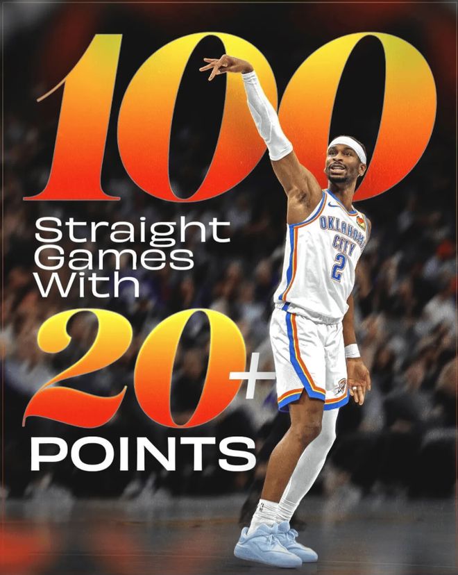 - NBA | 亚历山大已连续100场比赛得分上20,距离第一张伯伦仅差26场