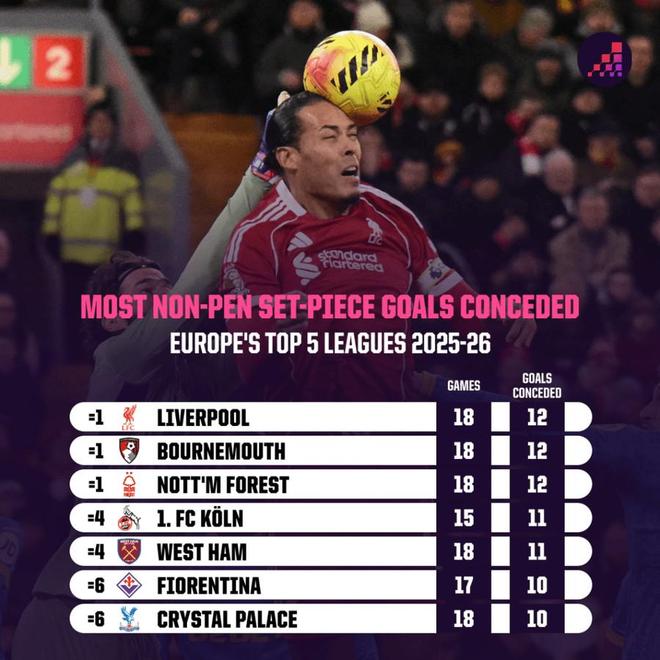数据网站OPTA统计,在2025-26赛季欧洲五大联赛中,利物浦、伯恩茅斯与诺丁汉森林三支球队并列成为非点球定位球失球最多的球队,均为18场比赛失球12个。