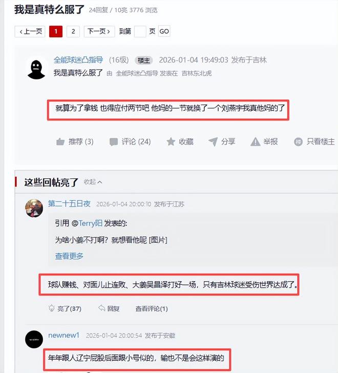 这场比赛在球迷看来,是一场默契球,吉林不但是有意放水,还被吉林球迷怀疑是输球为了赚钱。他们说,“就算为了拿钱 也得应付两节吧,他M的一节就换了一个刘燕宇我真他M的了"、”球队赚钱、对面儿止连败、大姜吴昌泽打好一场,只有吉林球迷受伤世界达成了。”
