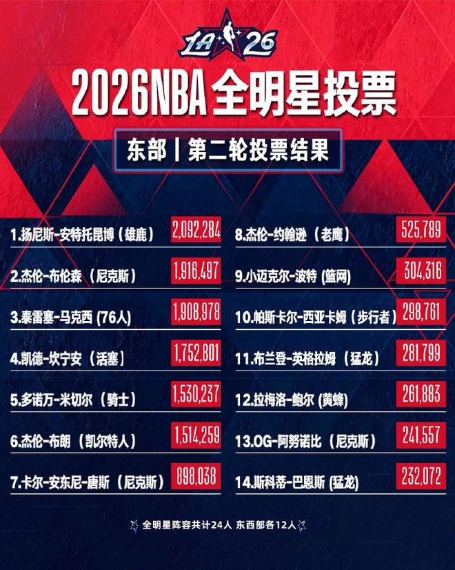 北京时间1月7日,NBA官方公布了2026年NBA全明星第二轮球迷投票结果,洛杉矶湖人后卫卢卡·东契奇与密尔沃基雄鹿前锋扬尼斯·安特托昆博,分别继续领跑西部和东部。东契奇为第二轮票王,詹姆斯位居西部第八。