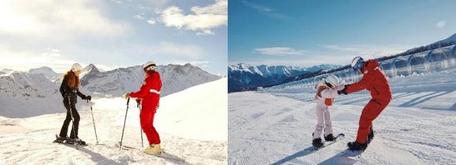 抵达度假村后,大家可以根据自己的滑雪水平,免费预约法国国立滑雪学校(ESF)的专业教练团体课程。初次尝试滑雪的新手,将从滑雪装备穿戴开始逐步入门滑雪;初级或中级滑雪者,将根据不同水平被分到绿道或蓝道,跟着教练从推坡、到掌握转弯技巧、熟悉雪道网络;如果是资深玩家,则可以挑战黑道,俯冲而下一览阿尔卑斯山的风光。