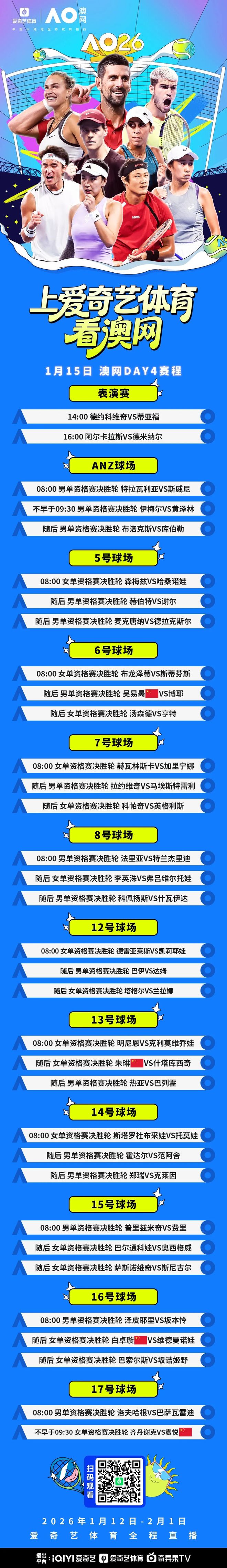 北京时间1月14日,爱奇艺体育全程直播的2026澳大利亚网球公开赛资格赛次轮开战,中国网协五位球员结束比赛。