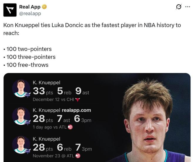 同时克努佩尔仅花费42场比赛就达成100记三分+100记两分+100记罚球里程碑,追平东契奇并列NBA历史最快。